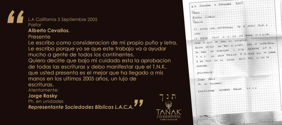 Traducida y transliterada del Hebreo al Español palabras textuales del Dr.Jorge Raskin, en las sociedades Biblica en CA, un lujo de escrituras, una de las versiones más apegadas a los originales.